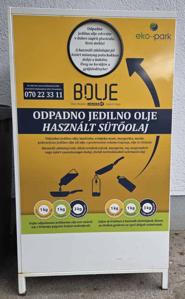 A konténerek szállítója, a BOLJE d.o.o. vállalat ezentúl gondoskodik a konténerek rendszeres ürítéséről, tisztításáról és zökkenőmentes üzemeltetéséről. A konténerekbe kizárólag használt háztartási sütőolaj helyezhető el, tehát a konténerekbe tilos bármilyen más veszélyes olajok és hulladékok elhelyezése.